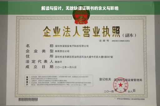 摘要:无故缺课证明书是一种针对学生缺课行为的证明文件,通常用于学校或教育机构中,用以确认学生是否未经许可或没有正当理由缺席课程。本文将解读这一证明书的含义,探讨其背后的目的和作用,旨在帮助读者更好地理解这一文件的重要性及其在学生管理中的作用。