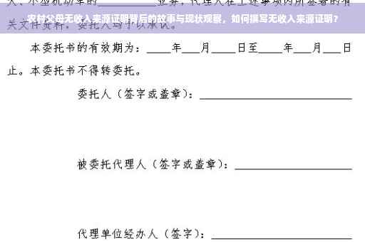 近年来,随着城市化进程的加速,越来越多的农村人口进入城市务工,农村留守老人和儿童问题逐渐凸显,农村父母无收入来源证明的问题成为了社会关注的焦点之一,本文将探讨这一现象背后的原因、影响以及可能的解决方案。