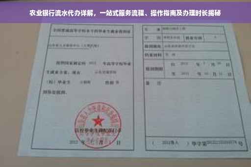 摘要:本文介绍了农业银行流水代办的一站式服务,包括操作指南和解析。该服务帮助用户快速获取银行流水记录,流程简便快捷。关于代办时间,具体取决于用户提交的材料是否齐全及银行处理速度等因素。本文旨在为用户提供全面的农业银行流水代办信息,帮助用户顺利完成业务办理。