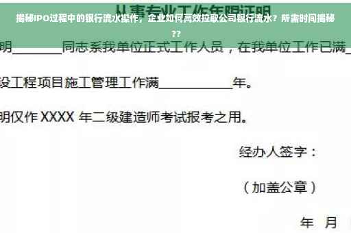 摘要:,,本文将揭示IPO过程中的银行流水秘密,解析企业如何顺利拉公司银行流水。文章指出,企业在IPO过程中需要提供银行流水证明,以证明其财务状况和资金流动情况。文章还将探讨拉公司银行流水所需的时间,并提供相关建议,以帮助企业在IPO过程中顺利完成银行流水的准备。