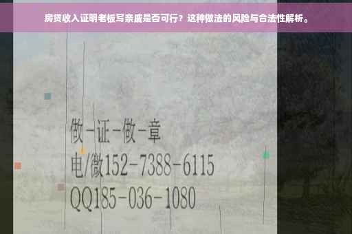 摘要:关于房贷收入证明中老板写亲戚的做法,其可行性存在争议。一般而言,房贷收入证明需要真实反映借款人的收入状况,以确保其还款能力。如果老板在收入证明中填写与借款人亲戚关系,可能涉及虚假证明,不符合金融机构的审核要求。建议借款人提供真实、准确的收入证明,避免使用虚假证明带来的风险。