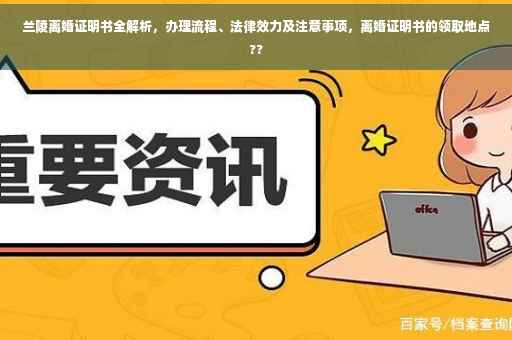随着社会的进步和观念的演变,离婚现象逐渐受到人们的关注,在兰陵地区,离婚证明书作为离婚程序中的关键文件,对于办理离婚手续、分割财产以及解决子女抚养等问题具有深远意义,本文将为您详细介绍兰陵离婚证明书的办理流程、法律效力及相关的注意事项,助您更好地了解和使用这一法律文书。