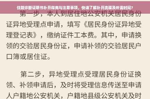 本文详细介绍了住院诊断证明书补开的流程、所需材料以及注意事项,希望读者在需要补开住院诊断证明书时,能够顺利办理手续,确保信息的准确性和完整性,读者在办理过程中需注意保护个人隐私,遵守医院规定,确保办理流程的顺利进行。