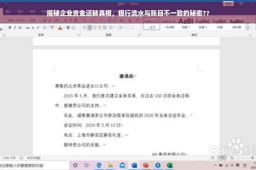 摘要:本文将探讨公司银行流水与账目之间的关系,揭示企业资金运转的神秘面纱。文章指出,银行流水与账目不一致是一个普遍存在的问题,可能导致企业运营风险增加。通过深入了解其背后的原因,如内部财务管理问题或不当操作等,我们可以更好地解决这一问题,确保企业资金安全、有效运转。
