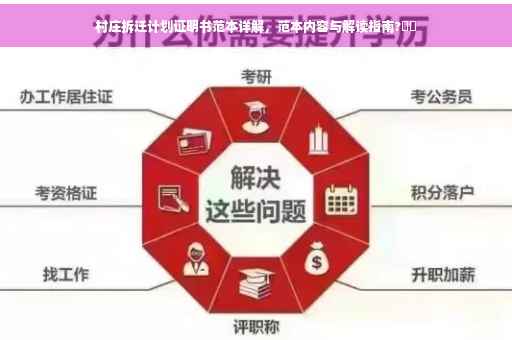 摘要:本篇内容主要介绍了村庄拆迁计划证明书范本及其详细解读,包括证明书的格式、内容以及使用注意事项等。还附带了相关图片以供参考。该拆迁计划证明书的规范制定,旨在保障拆迁工作的顺利进行,确保村民的合法权益得到保障。