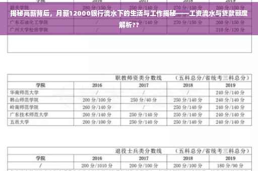 摘要:揭秘月薪12000的银行流水背后的生活与工作状态。高薪背后,或许承载着工作压力与生活成本的平衡挑战。关于工资流水为10000时能够贷款多少,取决于个人征信、收入稳定性及银行政策等多种因素。在追求高薪的同时,也需要合理规划个人财务与生活方式。