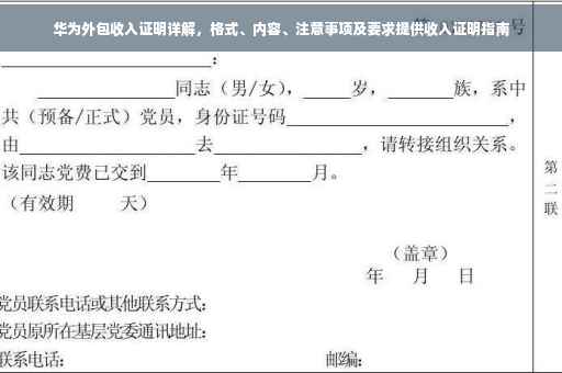 本文详细介绍了华为外包收入证明的写作方法,包括基本格式、具体内容、注意事项、用途及意义等,希望能够帮助外包人员更好地完成收入证明的写作任务,展示自身价值和能力,在写作过程中,务必确保准确、规范、清晰简洁,突出亮点,为未来的职业发展打下坚实的基础。