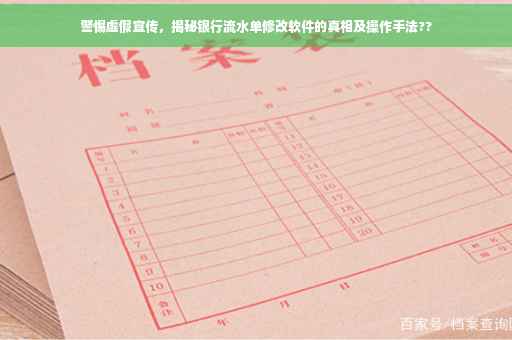 摘要:警惕虚假宣传,揭秘银行流水单修改软件的真相。这类软件声称能修改银行流水单,实则多为骗局。真实的银行流水单是银行记录的真实交易记录,无法篡改。建议谨慎对待,防范风险,合法合规处理银行事务。不要轻易相信不实宣传,以免陷入非法软件的陷阱。