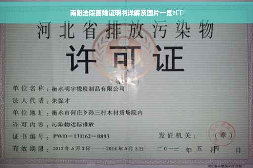 摘要:南阳法院离婚证明书是一份证明婚姻关系已经解除的官方文件。本文详细介绍了南阳法院离婚证明书的内容,包括其格式、所需材料、办理流程等。附上了相关的图片,以便读者更好地了解离婚证明书的样式。阅读本文,您将全面了解南阳法院离婚证明书的相关信息。