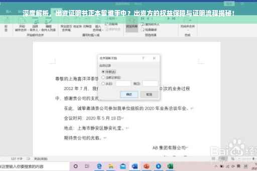 出资证明书在企业经济活动中占据重要地位,它不仅作为筹集资金的凭证,更是保障投资者权益的关键文件,本文将全面解析出资证明书的定义、作用,以及关于出资证明书正本应由谁留存的问题,帮助读者深入了解其内涵与外延。