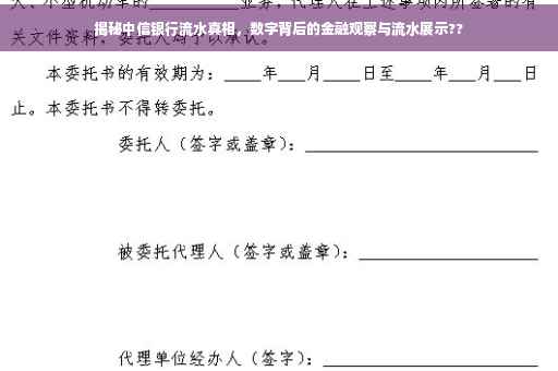 摘要:本文揭露了中信银行流水的数字真相,通过金融观察的方式为读者呈现了一个全面的视角。文章将展示中信银行流水的外观及其背后的金融活动,让读者了解流水的具体内容以及其在金融领域的重要性。通过本文,读者可以深入了解中信银行流水的真实面貌,并对其进行有效的金融观察和分析。