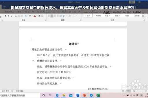 随着金融市场的繁荣,期货交易逐渐受到广大投资者的关注,在进行期货交易时,银行流水作为一个重要的参考指标,对于投资者而言具有不可忽视的作用,究竟什么是期货银行流水?它的重要性体现在哪些方面?本文将为您深入解析期货银行流水的含义、作用以及如何正确理解和运用它。