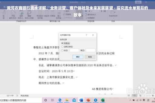 摘要:,,黄河农商银行流水详解,涵盖业务运营、客户体验及未来发展。该行通过优化业务流程、提升服务质量,实现流水账单的便捷操作。注重客户体验,通过智能化服务、个性化产品满足不同客户需求。展望未来,黄河农商银行将继续深化金融服务创新,拓展业务领域,提升竞争力,为客户提供更优质的金融服务。