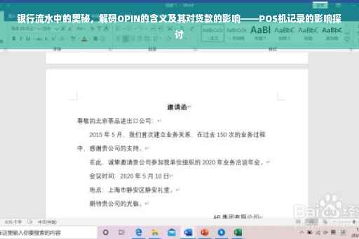摘要:银行流水中的pos机记录对贷款有一定影响。本文将揭示银行流水中的奥秘,解码OPIN的含义及其影响。通过解析银行流水中的交易记录,我们将探讨pos机交易记录如何影响贷款申请,帮助读者更好地理解银行流水的重要性。
