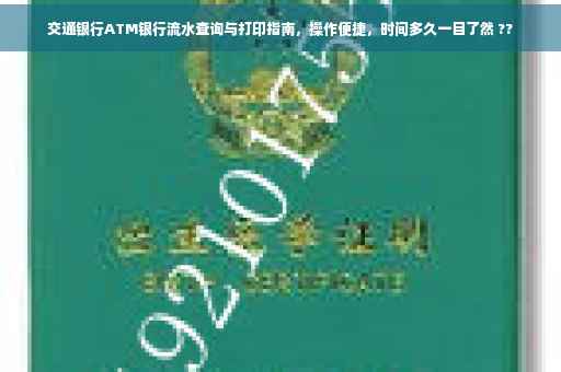 摘要:本指南介绍了如何通过交通银行ATM机查询和打印银行流水,操作简便快捷。用户只需按照指南步骤,在ATM机上选择相应选项,即可获取银行流水记录。关于流水拉取时间,银行流水通常可即时查询并打印,具体时效可能因银行系统更新或其他因素略有不同。