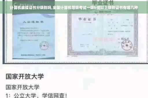 全国计算机等级考试一级b或以上级别证书有二级vb、二级c语言、二级C++、二级Java、二级WEB程序设计、二级VFP、三级PC技术、三级信息管理技术、三级数据库技术、三级网络技术等。 全国计算机等级考试(NationalComputerRankExamination,以下简称NCRE),是经原国家教育委员会(现教育部)批准,由教育部考试中心主办,面向社会,用于考查非计算机专业应试人员计算机应用知识与技能的全国性计算机水平考试体系。