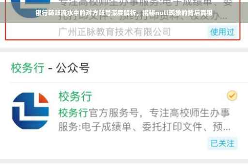 摘要:银行转账流水中的对方账号是交易的重要信息之一。本文将深度解析银行转账流水中的对方账号,探讨其含义和作用。针对对方账号显示为null的情况进行探讨和解析,帮助读者更好地理解银行转账流水的内容。
