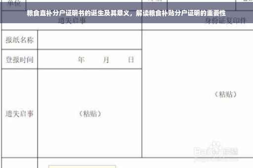 粮食直补分户证明书是在国家实施粮食直补政策的大背景下诞生的,该政策旨在给种粮农民提供一定的经济补贴,以减轻其生产负担,提高种粮积极性,在实际执行过程中,由于农村家庭结构的复杂性,如分家、离异等情况,导致粮食补贴发放时容易出现纠纷,为了解决这一问题,粮食直补分户证明书应运而生,此证明书使农民能够明确各自在农业生产中的权益,保障农民的合法权益,进而促进农村社会的和谐稳定。