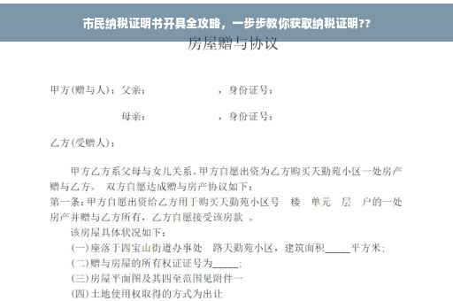 摘要:本文是一份关于市民纳税证明书开具的全攻略。文章详细介绍了市民如何开具纳税证明书,包括所需材料、流程、注意事项等。通过本文,读者可以了解到纳税证明书的开具过程,以及如何顺利、快速地获取纳税证明书。对于需要开具纳税证明的市民来说,本文提供了重要的指导和帮助。