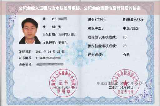 公积金作为社会保障制度的重要组成部分,对于广大职工而言具有极其重要的意义,随着社会的不断发展,公积金的作用越来越突出,不仅关乎职工的住房问题,还与职工的福利待遇、社会保障等方面紧密相连,本文将详细介绍公积金流水账收入证明的相关知识,帮助大家更好地了解公积金的重要性及其背后的秘密。