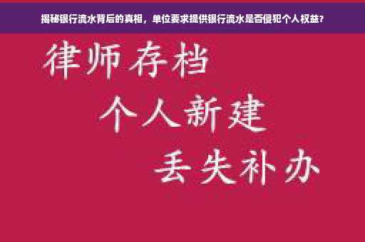 摘要:,,本文探讨了银行流水的重要性及其背后的真相。单位要求提供银行流水时,可能存在对个人隐私和权益的侵犯。通过深入了解银行流水的作用,本文旨在揭示这一问题,并提醒公众在提供个人信息时需谨慎。也提醒相关部门和企业应遵守法律法规,尊重个人权益,避免滥用个人银行流水信息。