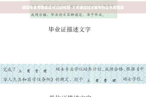 国家注册一级建造师证书;工信部认证的安全员证书;工程管理硕士之类的、工商管理硕士;设备厂家认证如光传输工程师证书、ccnaccnp等。通信工程是一门工程学科,主要是在掌握通信基本理论的基础上,运用各种工程方法对通信中的一些实际问题进行处理。