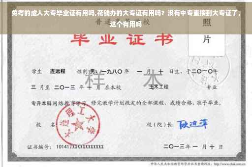 因为大专学历正在逐渐的被这个社会所淘汰,好多大型公司在招聘人才的时候对岗位设置的最低学历要求都必须要是本科起步才可以,全日制的大专都会被淘汰,那么你免考的成人大专毕业证书那就更加没有任何作用了,相当于就是花钱买了一个文凭是不被认可的。