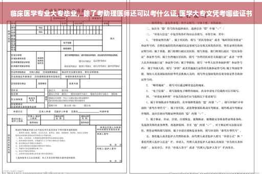 临床医学专业大专毕业,一般都是考助理医师证,然后做相关的工作后在考医师资格证; 据《中华人民共和国执业医师法》及有关规定具有下列条件之一的,可以参加医师资格考试: (一)具有高等学校医学专业本科以上学历,在执业医师指导下,在医疗、预防、保健机构中试用期满一年的; (二)取得执业助理医师执业证书后,具有高等学校医学专科学历,在医疗、预防、保健机构中工作满二年;具有中等专业学校医学专业学历,在医疗、预防、保健机构中工作满五年的。 (三)具有高等学校医学专科学历或者中等专业学校医学专业学历,在执业医师指导下,在医疗、预防、保健机构中试用期满一年的,可以参加执业助理医师资格考试。 以师承方式学习传统医学满三年或者经多年实践医术确有专长的,经县级以上人民政府卫生行政部门确定的传统医学专业组织或者医疗、预防、保健机构考核合格并推荐,可以参加执业医师资格或者执业助理医师资格考试。考试的内容和办法由国务院卫生行政部门另行制定。