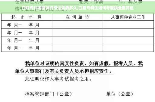 不管是大专毕业生,中专毕业生还是本科毕业生,都需要毕业后一年才可以报考执业医师资格证。其中,口腔医学大专毕业生和中专毕业生毕业一年后报考的是执业助理医师,口腔医学的本科生毕业一年后报考的口腔执业医师。这一年是需要一个正规口腔医疗机构给你开具一个试用一年的证明。