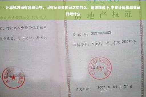 计算机在中国目前有三种从业资格证书,一类是操作证书,由劳动部门颁发,可通过各种社会培训机构参训后报名参加考试,如一级、二级和普通操作证书;二类是专业技术证书,由工信部组织考试,各省颁发证书,直接网上报名参加考试,分初级、中级、高级,如程序员、系统分析师、信息系统项目管理师、构架师等证书;三类是由专业信息公司组织专门的实用技术考试,颁发专业从业资格证书,如西门子交换机维护工程师、ORACLE数据库维护工程师、华为路由器售后服务工程师等证书。