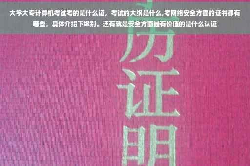 考试分为四个等级,不同等级的内容不同,一级主要考核微型计算机基础知识和使用办公软件及因特网(Internet)的基本技能。一级分为DOS版和Windows版,考核应试者计算机基本知识和使用微机系统的初步能力。考试科目有一级MS Office、一级WPS Office、一级Photoshop,一级共三个科目。一级WPS Office考试内容: (1) 选择题(计算机基础知识和网络的基本知识)。(2) Windows 操作系统的使用。(3) WPS 文字的操作。(4) WPS 表格的操作。(5) WPS 演示软件的操作。(6) 浏览器(IE)的简单使用和电子邮件收发。一级MS Office考试内容: (1) 选择题(计算机基础知识和网络的基本知识)。(2) Windows 操作系统的使用。(3) Word 操作。(4) Excel 操作。(5) PowerPoint 操作。(6) 浏览器(IE)的简单使用和电子邮件收发。一级Photoshop考试内容: (1)单项选择题 (含计算机基础知识部分,Photoshop 知识与操作部分)。(2)Photoshop 操作题(含3 道题目)。网络安全工程师最权威的证书有以下三种: