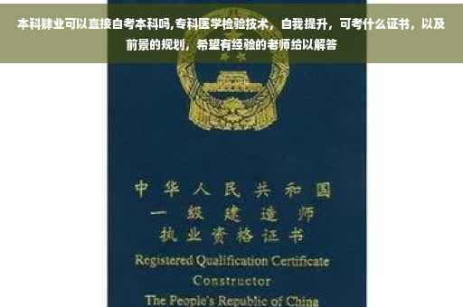 自考虽然不限制前置学历,但是初高中生、专科肄业不可以直接报考本科专业。高等教育自学考试的本科段专业都是题型在专科起点基础上设置的,国家承认学历的成人教育系列的专科及以上毕业生可以直接通过报考。专科及以上学历的在校生也可以报考,但自考本科毕业前必须先获得专科及以上学历毕业证书。不过,专科和本科可以同时报考,在领取本科毕业证书之前必须先获得国家承认学历的国民教育系列的专科及以上学历毕业证书。医学检验技术专科毕业,工作一年后可以考检验士,工作三年后可以考检验师。考取检验师资格证之后,担任检验师满五年,考主管技师。在之后就是副主任和主任技师了。话说,检验专业的在检验科工作的话只需要考取检验资格证书就可以了。其他资格证不需要。