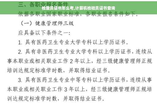 检查员证书是指符合规定条件的人员在经过资格审核、培训考核合格后经颁发的关于某一方面的专业资格证书,相关考试由国家或行业团体认可的机构负责实施。具体考试内容、报考条件和考试流程可能因不同国家和地区而有所不同,下面为您提供一些一般性的参考: