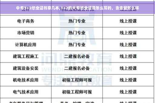 3+2大专是中专学校开设的一种班,就是初中毕业生在中专报名读五年书就可以直接拿大专毕业证了,其实是成人高考大专毕业证,只有通过对口高职进入的大专才是全日制,所以3+2的大专毕业证是成人高考大专毕业证,含金量不如全日制。
