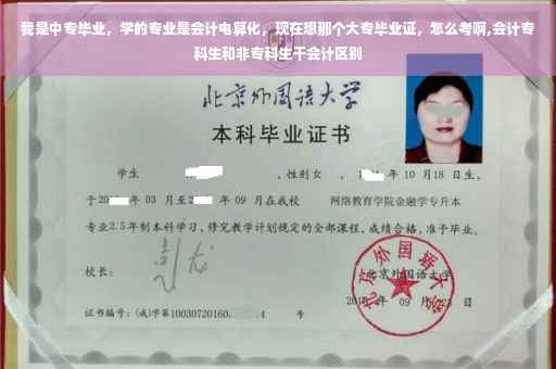 打算今年的11月份报考成人高考。明年的6月份考试。考完之后也有录取的学校或者你填一个你想读的大学。然后再读3年就可以拿一个大专文凭了(前提是要有学费啊。成人高考是比较让人承认的) 还有一种方式是参加成人教育学校,只要你交钱去,考试。然后三年之后也是拿一张文凭。会计专科生和非专科生干会计最大的区别就是一个有理论知识,在实践中更容易上手。