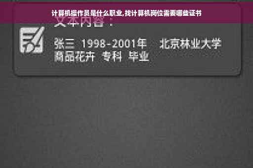 职业概况:1、职业名称:计算机操作员2、职业定义:使用电子计算机微机从事文字、图形、图像等信息处理工作及计算机系统操作、维护与管理的员。3、职业等级:本职业共设三个等级,分别为初级(国家职业资格五级)、中级(国家职业资格四级)、高级(国家职业资格三级)。