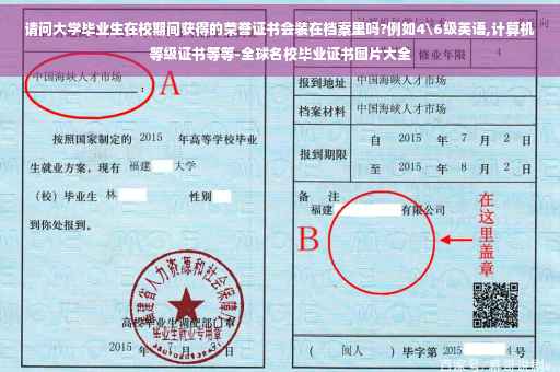 大学毕业生在校期间获得的荣誉证书会,例如4\6级英语,计算机等级证书等等.这些东东是国家认证的,当然会有记录的,当然不是把证书放在里面,放不下,但是里面有你的记录:如XX年,XX以XX分通过了国家英语四级等.但是另外的一种情况,如:你在学校的演讲比赛得奖,在作文大赛里面得奖,或者就是说班上或者社团里面获得奖,如果你上报了的话,会在你的每学期的记录上获奖情况那一栏有的,如果没有上报的话就没有了.学校现在应该都有素质拓展的认证吧,上面有详细的记录.北京反正基本的学校都有!放心吧,四六级,计算机啊是有的!!!:)
