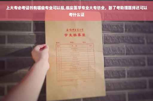 临床医学专业大专毕业,一般都是考助理医师证,然后做相关的工作后在考医师资格证; 据《中华人民共和国执业医师法》及有关规定具有下列条件之一的,可以参加医师资格考试: (一)具有高等学校医学专业本科以上学历,在执业医师指导下,在医疗、预防、保健机构中试用期满一年的; (二)取得执业助理医师执业证书后,具有高等学校医学专科学历,在医疗、预防、保健机构中工作满二年;具有中等专业学校医学专业学历,在医疗、预防、保健机构中工作满五年的。 (三)具有高等学校医学专科学历或者中等专业学校医学专业学历,在执业医师指导下,在医疗、预防、保健机构中试用期满一年的,可以参加执业助理医师资格考试。 以师承方式学习传统医学满三年或者经多年实践医术确有专长的,经县级以上人民政府卫生行政部门确定的传统医学专业组织或者医疗、预防、保健机构考核合格并推荐,可以参加执业医师资格或者执业助理医师资格考试。考试的内容和办法由国务院卫生行政部门另行制定。