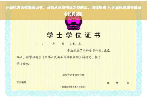计算机在中国目前有三种从业资格证书,一类是操作证书,由劳动部门颁发,可通过各种社会培训机构参训后报名参加考试,如一级、二级和普通操作证书;二类是专业技术证书,由工信部组织考试,各省颁发证书,直接网上报名参加考试,分初级、中级、高级,如程序员、系统分析师、信息系统项目管理师、构架师等证书;三类是由专业信息公司组织专门的实用技术考试,颁发专业从业资格证书,如西门子交换机维护工程师、ORACLE数据库维护工程师、华为路由器售后服务工程师等证书。