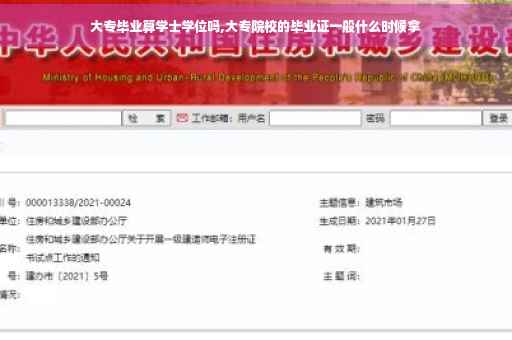 大专毕业时只有大专文凭、所在学校的毕业证以及所学专业的职业资格证书。其他的证书都需要考取,唯独没有学位证书,本科以上才有学位证。
