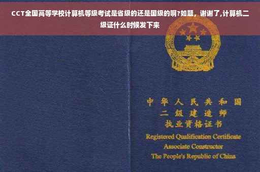 由省教育厅颁发《CCT全国高等学校计算机考试证书》合格证书,属省级证书。NCRE 是指全国计算机等级考试,由教育部考试中心发合格证书。这两种证书在全国各省都有统考,在全国范围内有效,并受到社会的广泛认可,都能作为衡量计算机应用水平高低的标准。各校所考的证书种类由学校而定。1、一般情况下是考试结束后50个工作日左右出成绩及出证。全国计算机等级考试证书一年两次考试。每年的3月与9月考试。