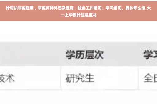 按照实际情况填写:1、计算机掌握程度:(是否考证)高级办公自动化,计算机二级证书,是否熟练掌握办公室软件(word文档,microsoft文档),还有最基本的打字速度,或者掌握其他的电脑技术,如3D动画,flesh等;2、外语及程度:英语(四六级,专业四级专业八级)、日语(初级,中级或一级二级,三级,四级)、俄语、德语等;3、社会工作经历:在何处实习或工作过;4、学习经历:最近5到8年学校学习内容,培训机构的学习等(包括出国留学等皆可)。