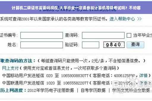 不需要。计算机等级考试并不是取得大学毕业证书和学位证书的必要条件,除了部分大学将大学英语4级考试与学位证书挂钩外,其他国家的等级考试均和毕业证书、学位证书没有任何关系,学生不用担心。