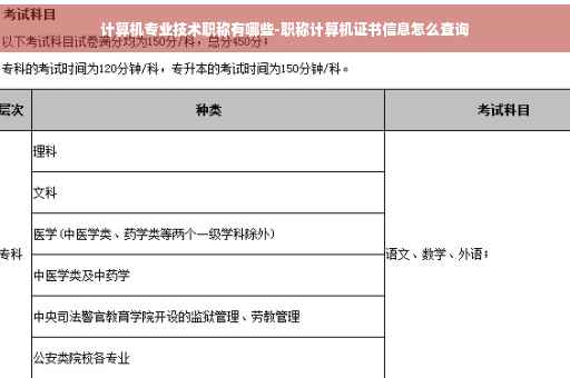 计算机专业技术职称有全国计算机信息高新技术考试,全国计算机信息高新技术证书作为反映计算机操作技能水平的基础性职业资格证书,在要求计算机操作能力并实行岗位准入控制的相应职业作为上岗证;在其它就业和职业评聘领域作为计算机相应操作能力的证明。