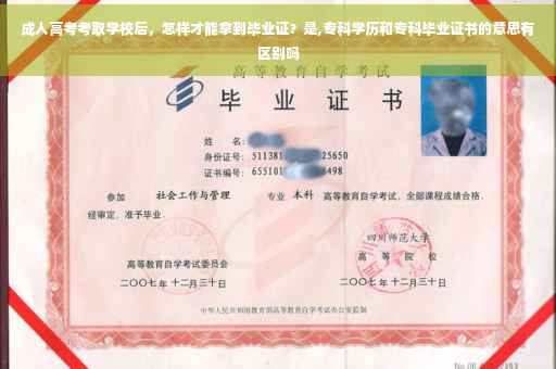 2.成人高考的考试就相当于普通高中生考大学一样,考上了达到了学校的录取分数线,就能到相应的学校就读。不同的是成人高考考试分数线较低,录取率很高,比较适合社会大众学习,而高考难度很大,但是两者的毕业证书效力是相同的,都是国家承认的正规学历。3.成人高考的授课方式大体分为脱产、业余及函授三种形式,成考生应根据自身的情况来选择适合自己的学习形式。注:脱产、函授和业余的学习形式所发毕业证书没有区别。4.成考学习一般都是函授方式,每年上指定的地方(学校)上课学习;自考本科报名需要有专科毕业证也可不需要,但是你领取本科毕业证书前必须有专科毕业证书。自考是没有集中学习的,但是考试是集中考试。是一样得。我也是高职专科学校毕业。也就是所谓得大专毕业证。唯一得区别在于,现在很多5年制得大专,和正规大学得专科毕业证。这两个都称为大专。在使用方面,5年得可能会打点折扣。不过现在很多公司单位都比较看重能力,学历只要和他们要求的差不多就行!
