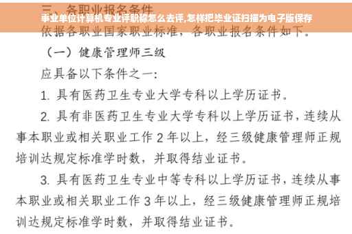事业单位计算机专业评职称方法如下:本科计算机专业毕业进事业单位一年后转正,转正后即直接认定为初级职称,需要评聘更高级别的职称需要参加职称计算机考试与职称英语考试,只有通过了相应级别(一般中级3个考试科目,副高级4个考试科目,高级5个考试科目)的考试才能评上职称。