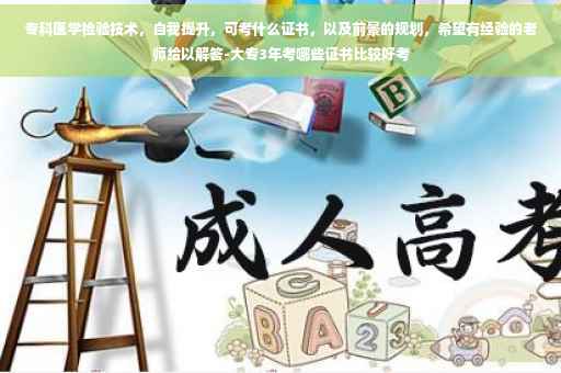 医学检验技术专科毕业,工作一年后可以考检验士,工作三年后可以考检验师。考取检验师资格证之后,担任检验师满五年,考主管技师。在之后就是副主任和主任技师了。话说,检验专业的在检验科工作的话只需要考取检验资格证书就可以了。其他资格证不需要。