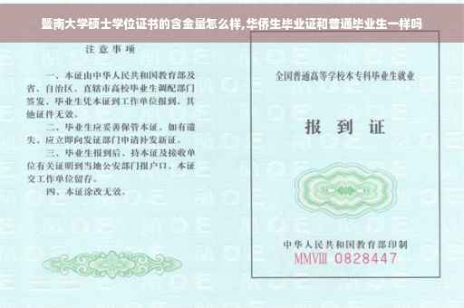 华侨生毕业证和正常的毕业证是一样的,华侨生联考和考高考上学校只是两种升学途径,但是这两个学历是没有任何区别的,所以毕业证书也没有任何区别,华侨毕业生也和其他学生一样享有一样的毕业待遇。华侨生联考的概念越来越被国人熟知,这是一项对于华侨以及港澳台子女单独设立的高考,与我们每年6月份的高考是平行的,但是与之不同的是,它的录取分数线很低,可以凭借低于高考成绩近百分的成绩进入国内的名校。