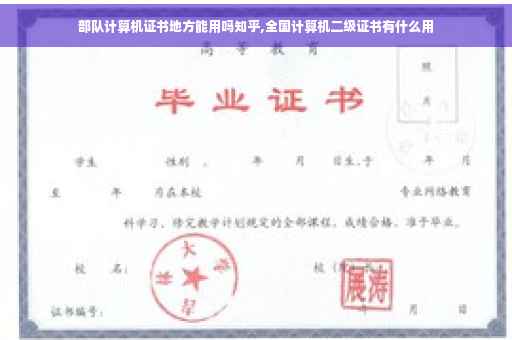 用到二级的也就是会计、计算机、通信类的、信息类的;但是相对来说这个证又太低。如果是为了给自己加分请参考下面的例子。1:综合测评加分,而综合测评与奖学金挂钩。2:保研加分 3:评各类其他证书,如三好学生等 4:自考免考计算机 对于即将找工作的用处如下 1:很多单位不做要求的,但是你就业的时候有这个证书,他们会更倾向你 2:到上落户口必须要过5个计算机水平考试,计算机等级是其中之一,其他的考试是: 参照《上海市教育委员会、上海市发展计划委员会、上海市人事局关于印发〈上海市高等学校毕业生就业办公室关于2003年上海市引进非上海生源高校毕业生进沪就业落户工作的规定〉的通知》(沪教委学[2003]13号文件)的精神,计算机应用能力水平相关要求摘要如下: 申请进沪就业的非上海生源毕业生计算机应用能力须获得下列证书之一: 1. 全国计算机等级考试证书(文科专业学生为一级,理工科专业学生为二级); 2. 全国计算机应用技术证书(文科专业学生为“文字处理”模块,理工科专业学生为“电子表格”或“C语言”模块); 3. 上海高校非计算机专业学生计算机应用知识和应用能力考试证书(文科专业学生为一级,理工科专业学生为二级); 4. 上海市计算机应用能力考核证书(文科专业学生为“办公自动化”,理工科专业学生为“中级”); 5. 其它由学校所在地的省、自治区、直辖市级教育行政部门举办的计算机应用能力水平考试的合格证书。到此,以上就是小编对于部队计算机证书地方能用吗的问题就介绍到这了,希望介绍关于部队计算机证书地方能用吗的4点解答对大家有用。