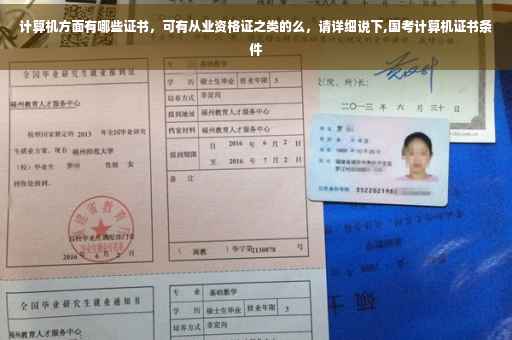 计算机在中国目前有三种从业资格证书,一类是操作证书,由劳动部门颁发,可通过各种社会培训机构参训后报名参加考试,如一级、二级和普通操作证书;二类是专业技术证书,由工信部组织考试,各省颁发证书,直接网上报名参加考试,分初级、中级、高级,如程序员、系统分析师、信息系统项目管理师、构架师等证书;三类是由专业信息公司组织专门的实用技术考试,颁发专业从业资格证书,如西门子交换机维护工程师、ORACLE数据库维护工程师、华为路由器售后服务工程师等证书。